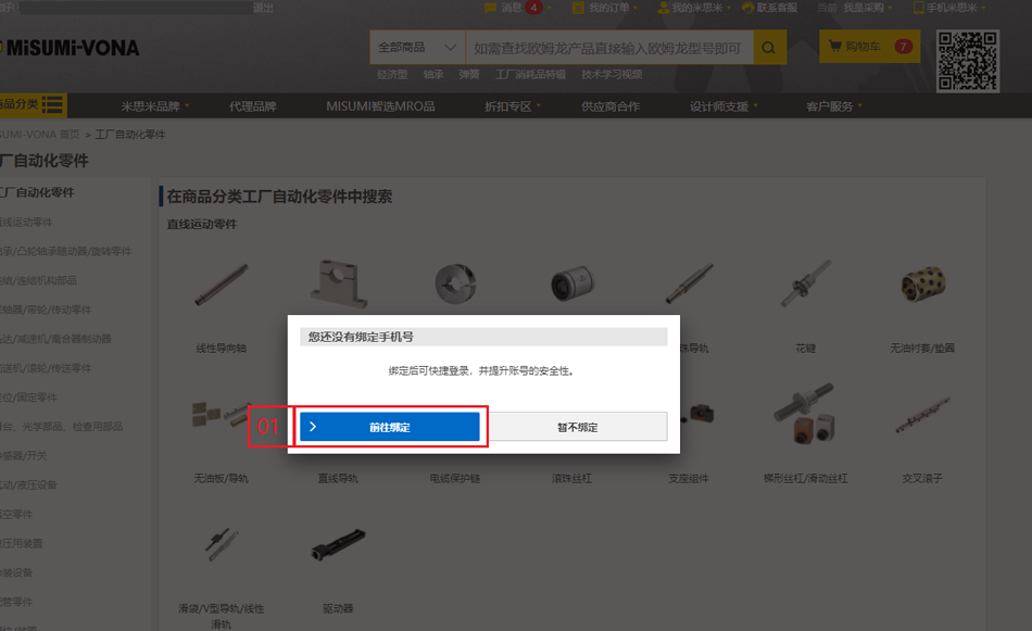 入口一:老用戶登錄米思米官網(wǎng)后,頁面會出現(xiàn)彈屏提示,點擊【前往綁定】即可進入綁定頁面。