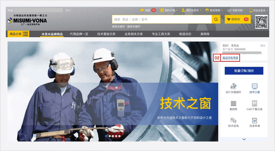入口二:老用戶登錄米思米官網(wǎng)后,點擊米思米官網(wǎng)首頁【驗證手機號碼】即可進入綁定界面。