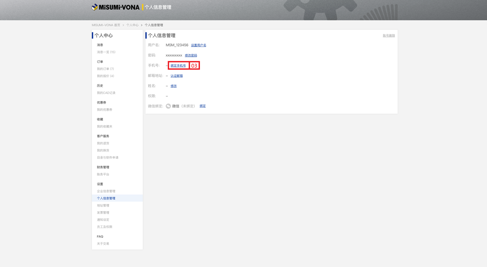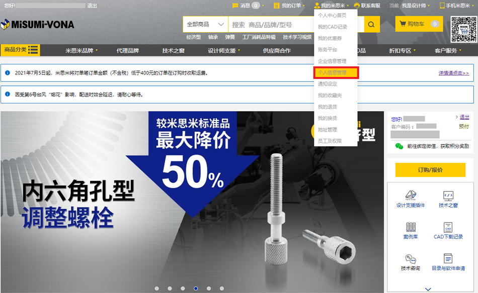 入口三:①老用戶登錄米思米官網(wǎng)后,點擊米思米官網(wǎng)首頁【我的米思米】-【個人信息管理】。