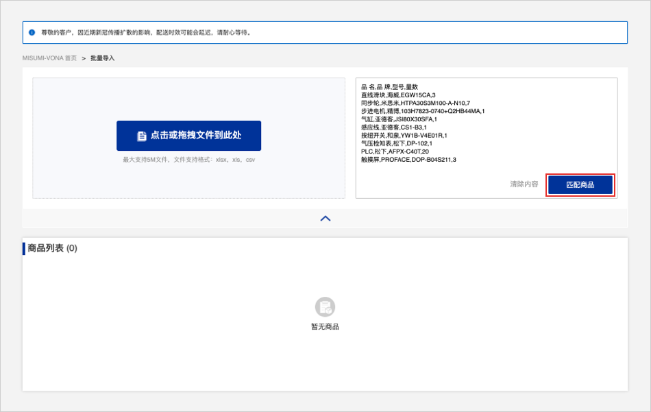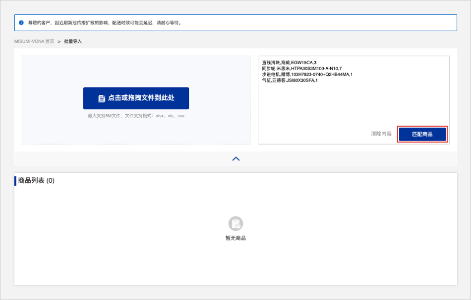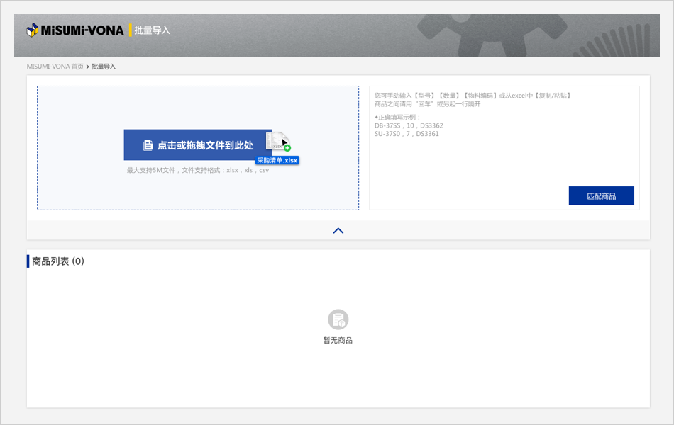 上傳方法四:手動(dòng)輸入商品型號、數(shù)量等物料,點(diǎn)擊【匹配商品】即可查看導(dǎo)入結(jié)果