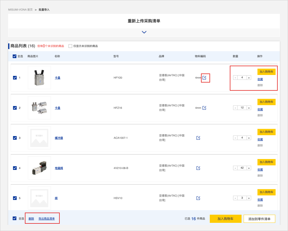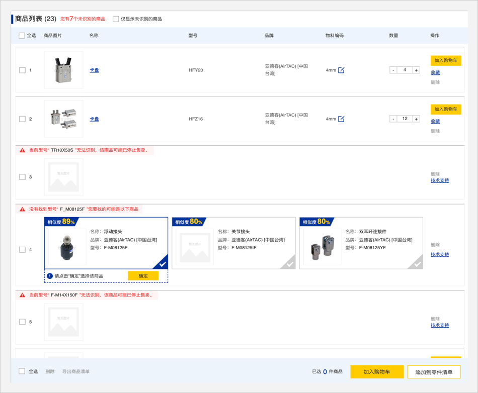 對于正常商品選中后可以【加入購物車】【添加到零件清單】【導(dǎo)出商品清單】【刪除】【收藏】以及物料編碼和數(shù)量的編輯