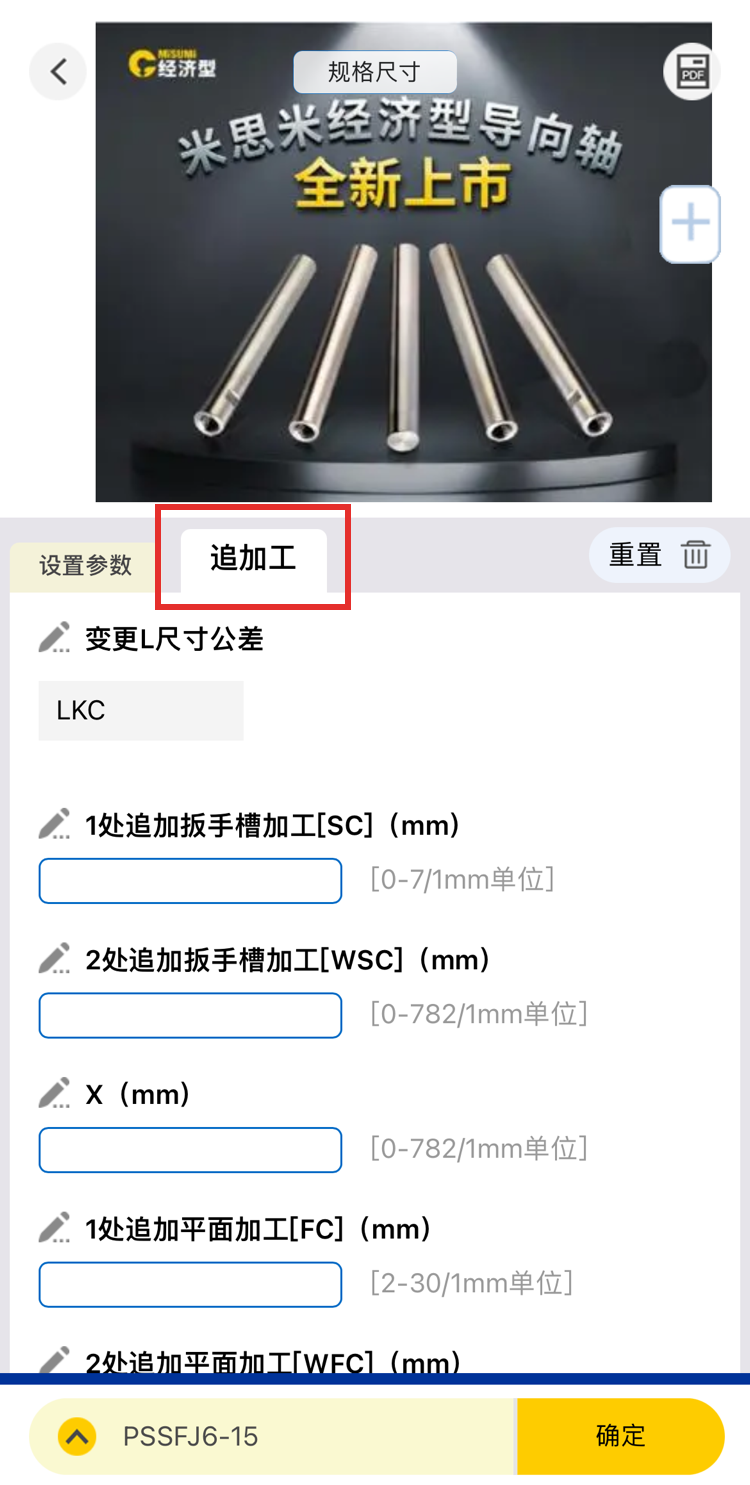 左側(cè)及頭部有【追加工】選項框,根據(jù)商品屬性追加參數(shù)。