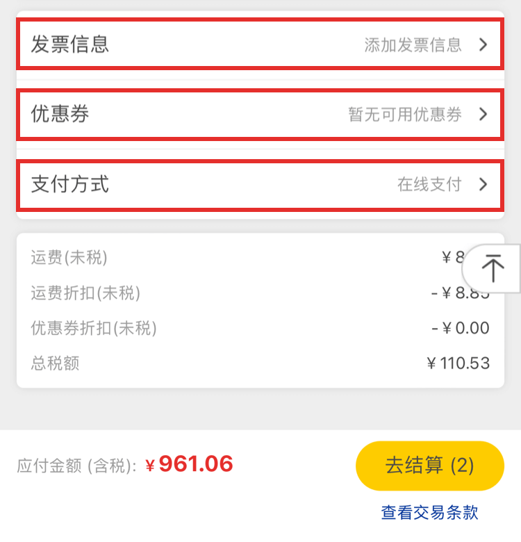 如無問題,請點擊【去結算】。將進入結算頁面。