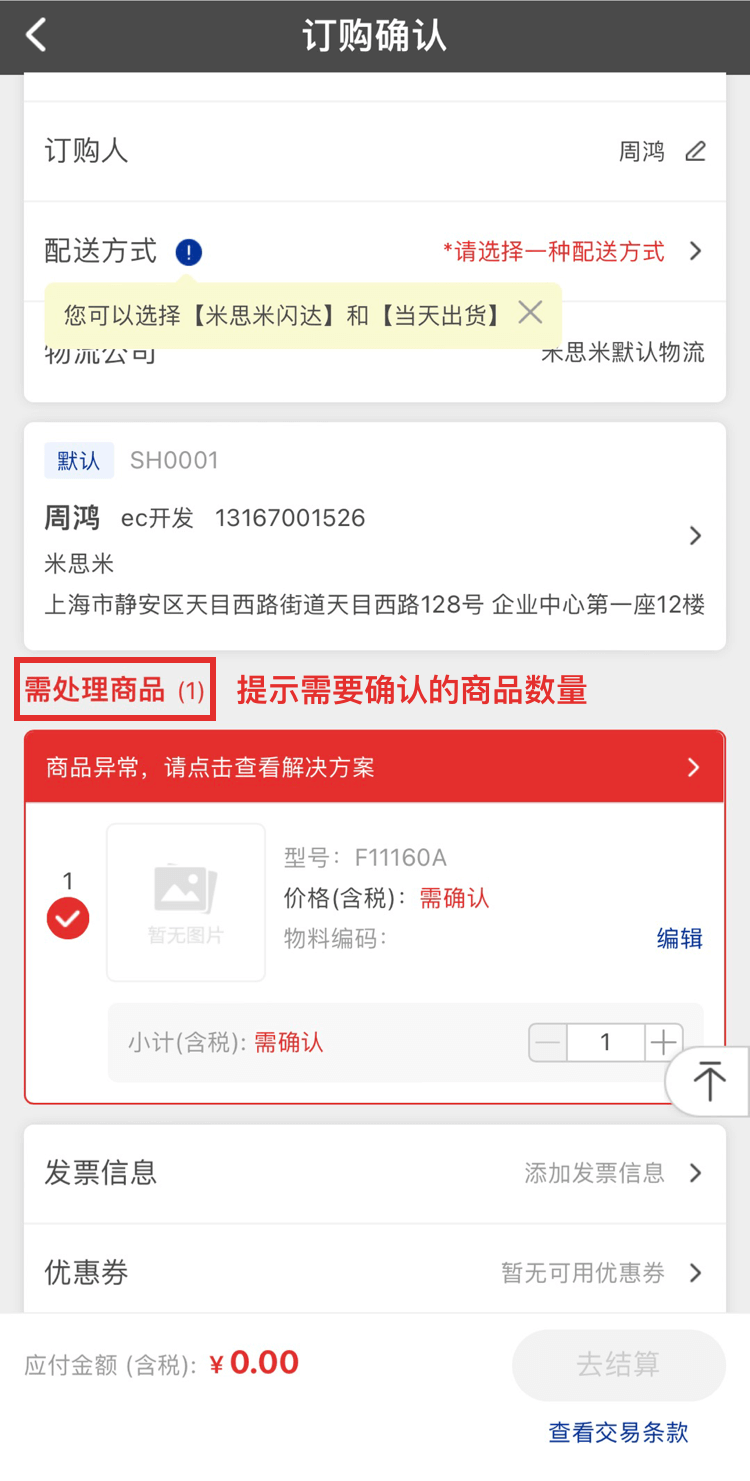 訂單中有需要確認的商品時,請按照相應的提示信息進行逐個操作。修正完畢,點擊【去結算】,將更新訂單信息。如未能正確修正時,將再次顯示本頁面。如需米思米幫助解決,