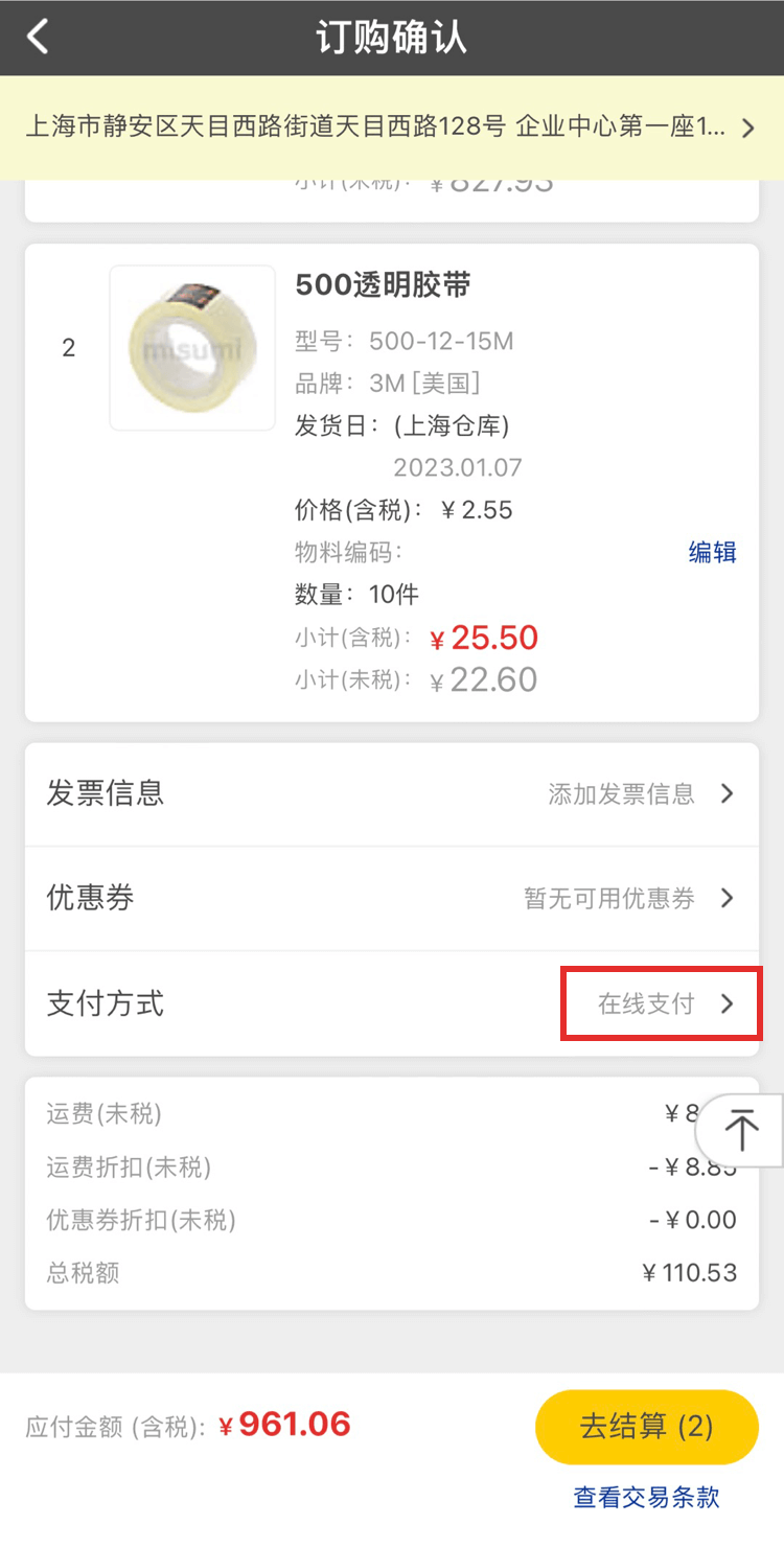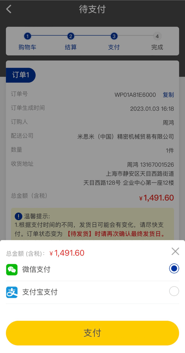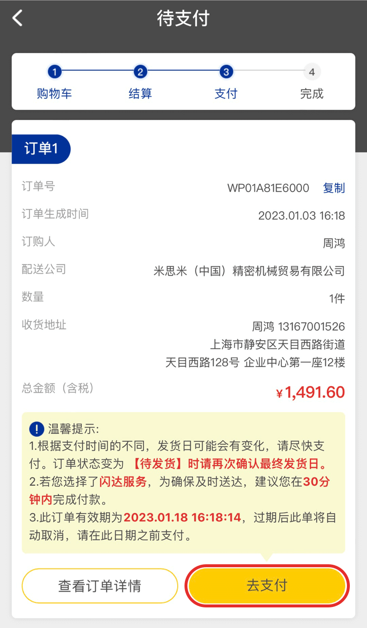 如果您的支付方式為在線支付,在待支付頁面點擊【去支付】選擇支付方式。