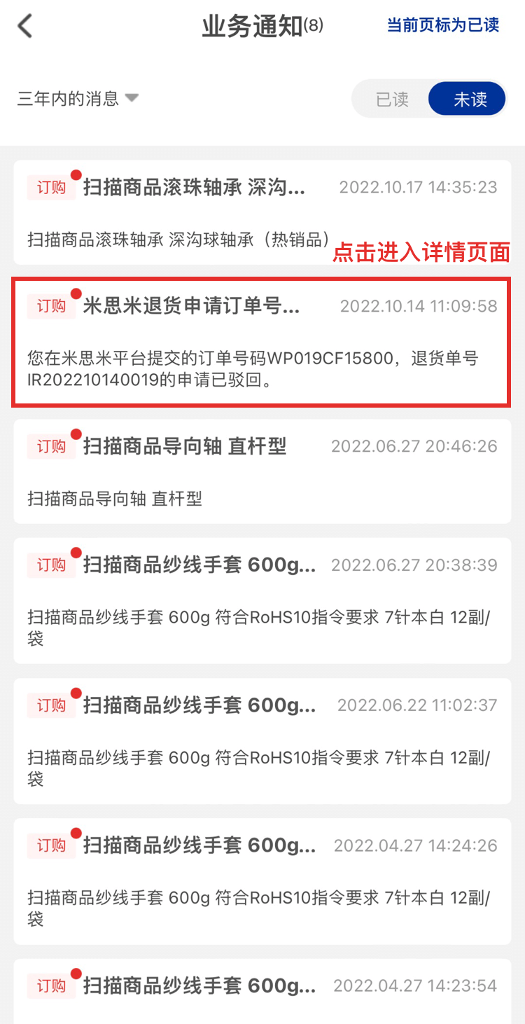 進入到消息頁面后,點擊【查看詳情】。跳轉到消息詳情頁。通過米思米提供的鏈接,點擊進入到詳情頁面。