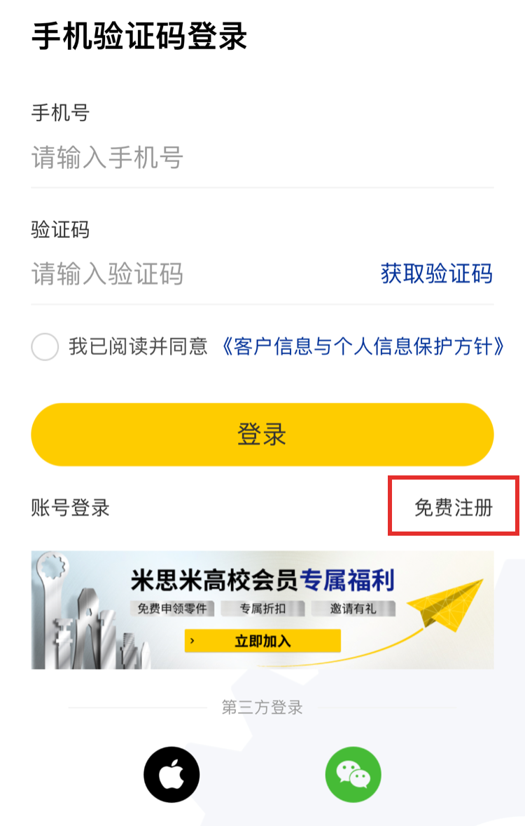 1.點(diǎn)擊米思米首頁【免費(fèi)注冊/登錄】