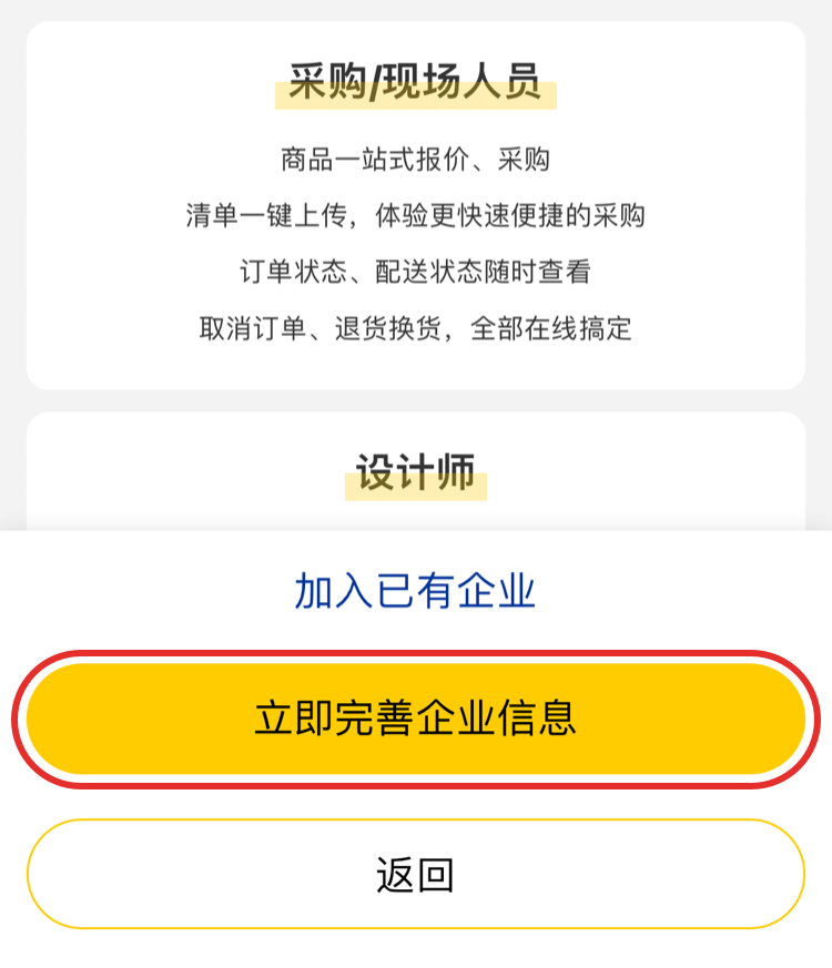 1.注冊成為米思米個(gè)人會員后,直接在完成注冊的頁面點(diǎn)擊【立即完善企業(yè)信息】?;蛘咴谑醉撨x擇【去完善】/【完善企業(yè)信息】。