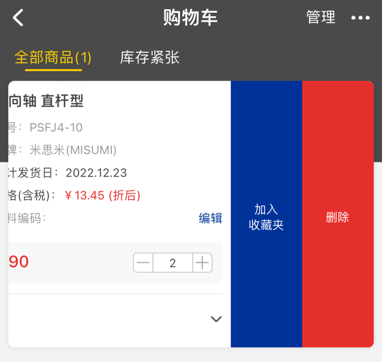 三、如果您想購買多件商品,可修改購買數(shù)量,在購物車中,您可以左滑點(diǎn)擊刪除按鈕刪除商品。