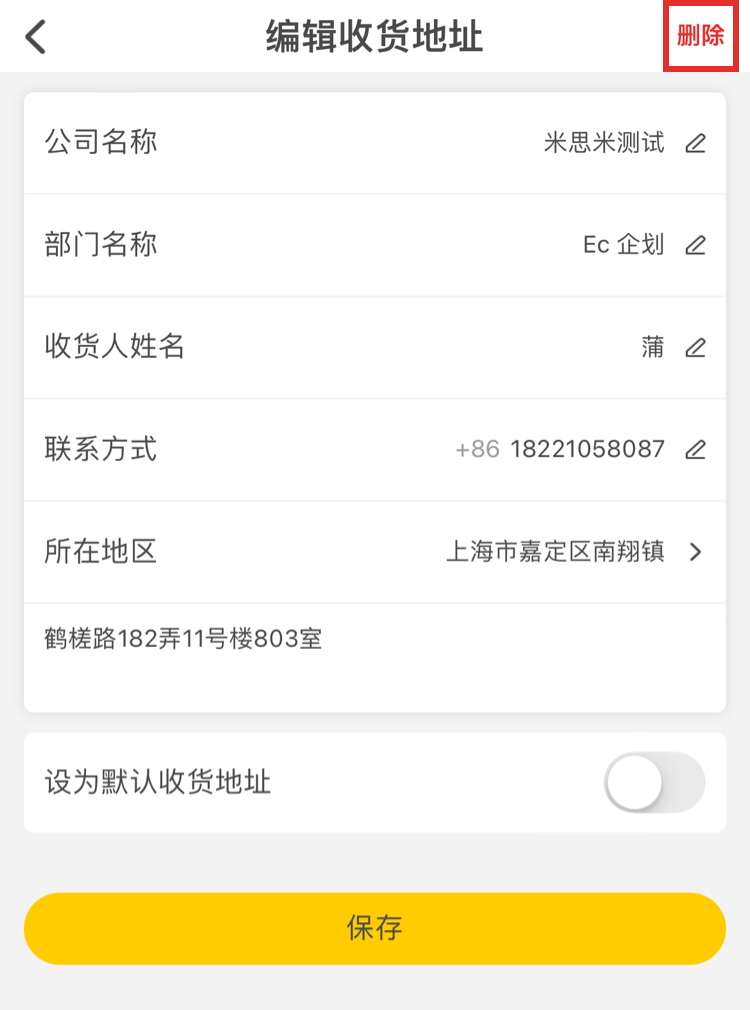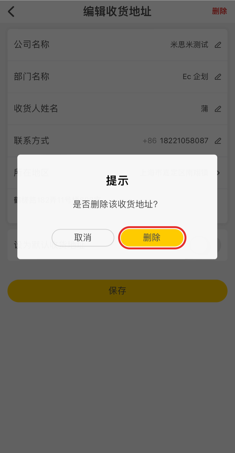 3.您可以根據需求選擇編輯或刪除地址。編輯地址后點擊【保存】即可保存。刪除地址點擊【刪除】彈出彈窗點擊【刪除】即可刪除。