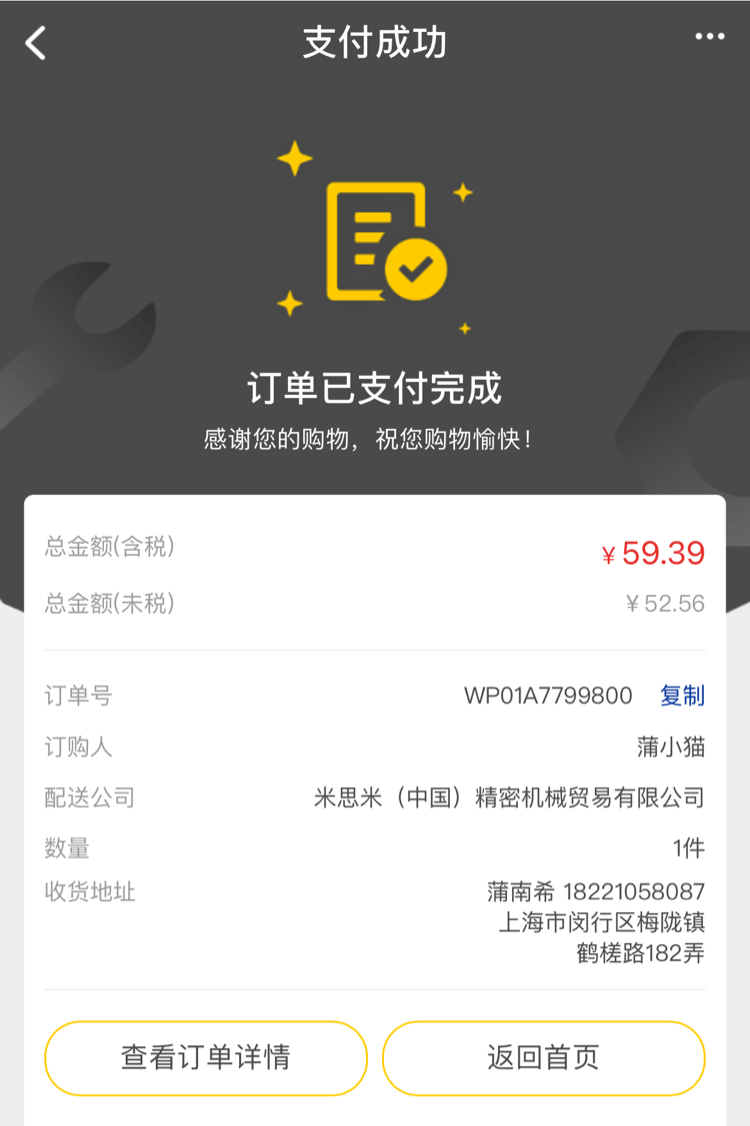 訂單支付完成,可點(diǎn)擊【查看訂單詳情】,也可點(diǎn)擊【返回首頁(yè)】繼續(xù)購(gòu)物。