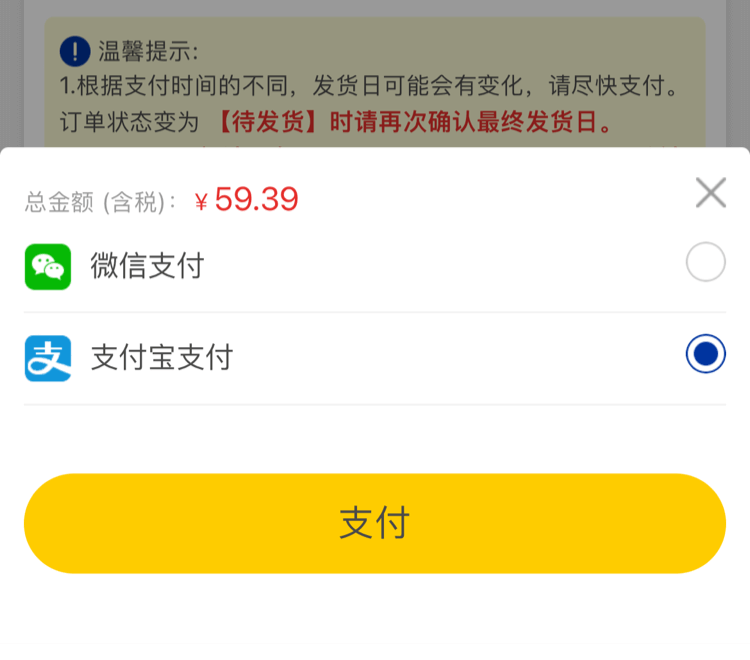 顯示已經(jīng)下訂的訂單概要,確認(rèn)無(wú)誤后選擇支付平臺(tái)進(jìn)行付款。