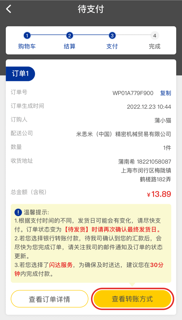 到達(dá)支付頁(yè)面,點(diǎn)擊【查看轉(zhuǎn)賬方式】按鈕,就可以查看了。